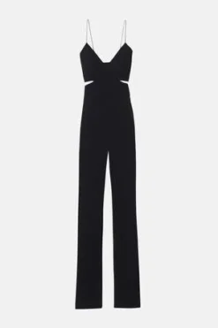 The Milan Jumpsuit is impeccably crafted from a stretch crepe fabric in timeless black. This minimal silhouette features corset-inspired detailing, small side cutouts for a chic skin reveal, and delicate straps that may need a slight adjustment to accommodate a variety of bust sizes. Size up for a slightly more comfortable fit.