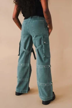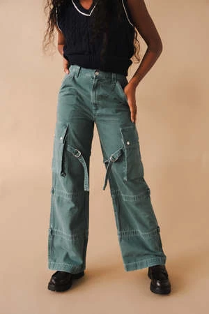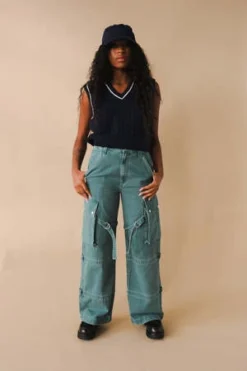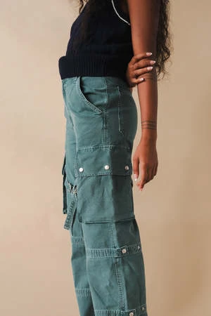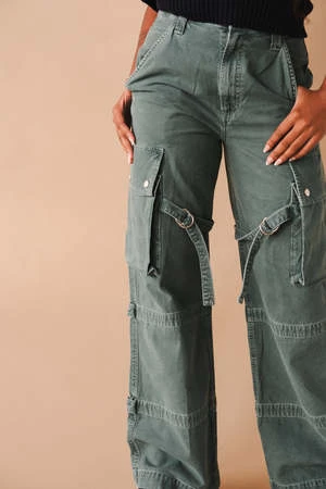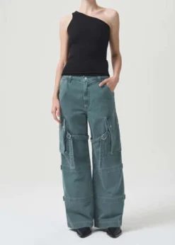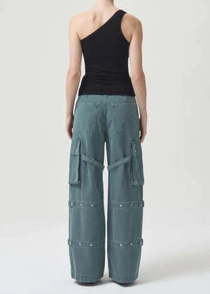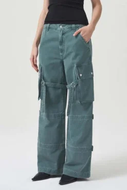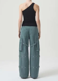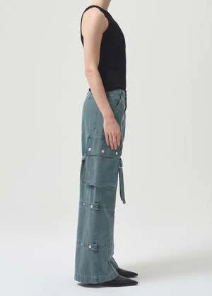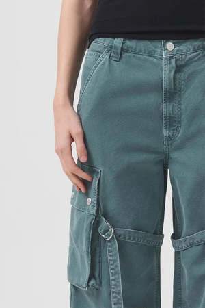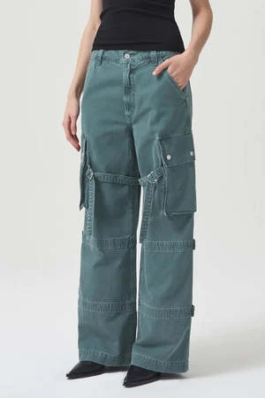 Agolde Vivian cargo pant in muted washed absinthe green. Designed with the ultimate slouchy silhouettea flattering high-rise, relaxed fit through the hips and leg, and a full-length inseam. The oversized pockets and the cargo seam detailing make this head-turning pair the piece you need now. Straps can be worn on the inside or outside of the leg. Non-stretch, midweight yet breathable cotton with a super smooth hand. Zip fly.