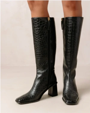 The iconic must-have high knees are now crafted from black croc-effect vegan leather. These timeless tall boots feature a squared toe and a side zipper for extra comfort. Their elongated block heel adds flattery and pizzazz to your strut. Expand your footwear rotation with a glamorous pair of East and take on colder days in style.