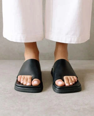 Anatomical sole silhouette featuring an open toe and open back. Toe ring detail detail for a no frills aesthetic and a strong hold.