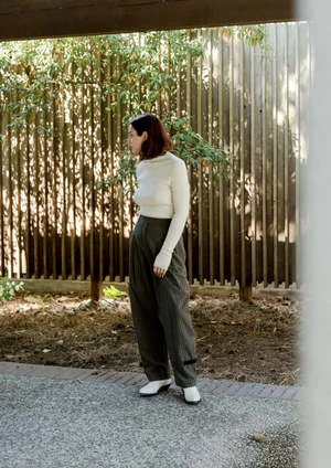 Dark brown wool pants from Amomento, featuring a vertical chalk stripe. Front pleating creates a relaxed leg line with a velvet band at the ankles allowing for a change in silhouette. The striped wool fabric lends a vintage feel, while the detailing and silhouette add a modern spin. Fully lined.