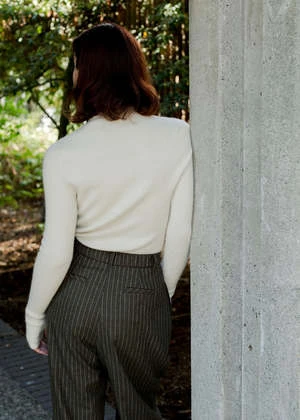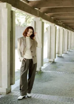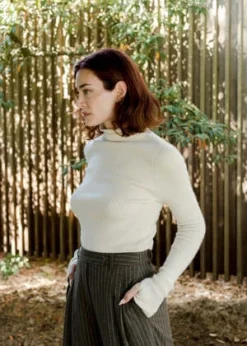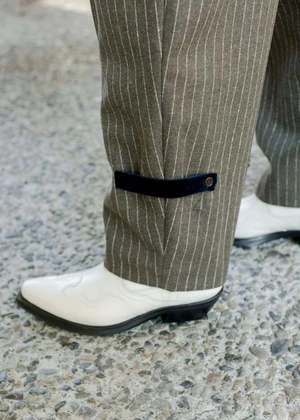 Styled with the Lauren Manoogian | Rib Mockneck | Raw White, Ganni | Mid Shaft Embroidered Western Boot | Egret, and Rachel Comey | Ango Vest | Light Brown.