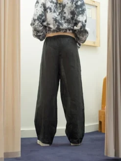 Airy trouser with loose fit, elastic waist, in black linen. Side pockets.
