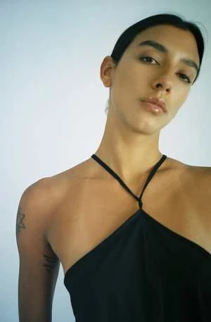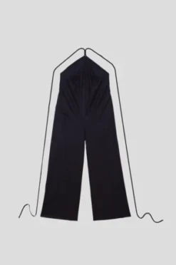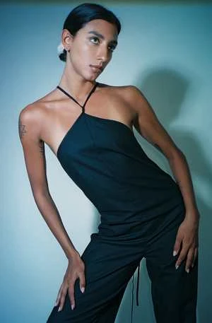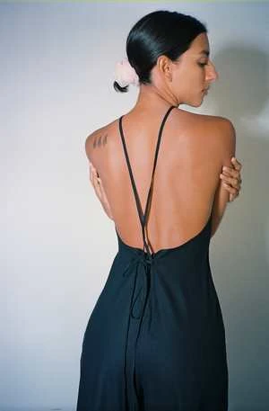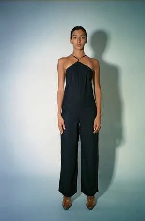 Black halter neck jumpsuit in wild silk. Features an open back and straight slightly flared leg. Straps can be tied multiple ways.