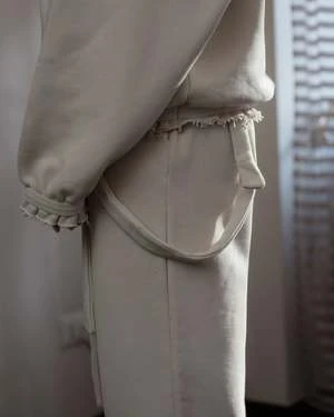 Cotton jersey sweatpant from Baserange with a pull-on style and long ties at the waist. Raw edges add a twist to this otherwise simple piece of loungewear. Pair with the matching Route Sweatshirt for a cozy set.