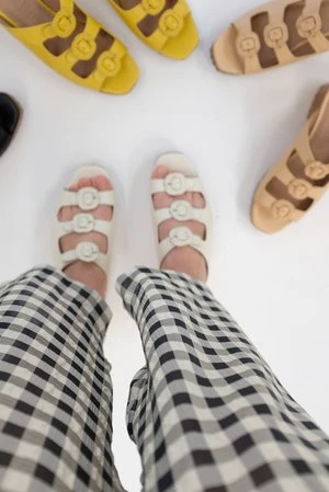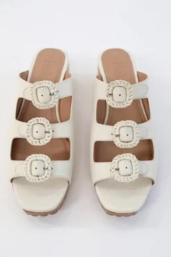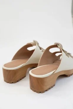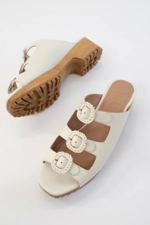 Soft glove leather upper, hand carved wooden platform heel. Ultra cozy comfy low clog with tread bottoms for all day wear. Square toe, 3 adjustable leather wrapped buckles, leather lined.