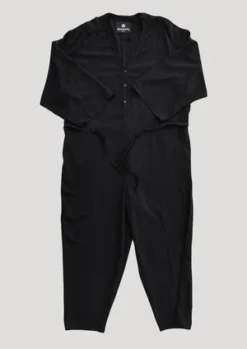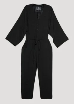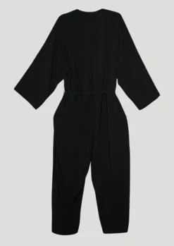 Long jumpsuit with wide rollup sleeves, V-collar with buttons, side pockets and belt