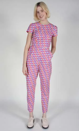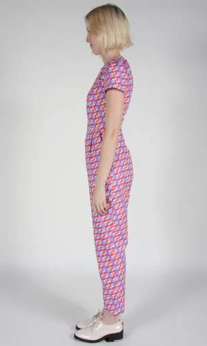 A fitted, flattering jumpsuit with front pockets, a capped sleeve, and a back invisible zipper closure.