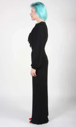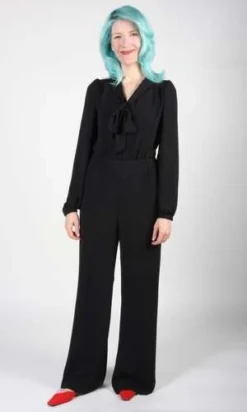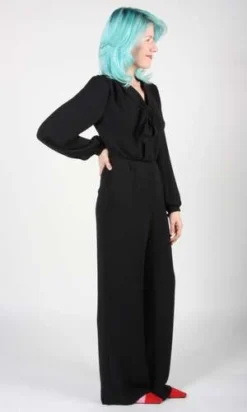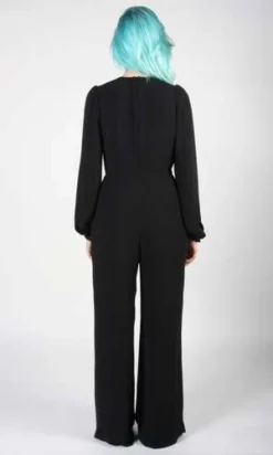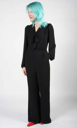 Thrasher is the ultimate, opulent 70s style jumpsuit you didnt even know youve been seeking! It has a full bell sleeve, a tailored waist and hip area with wide cut legs, pockets in the pant and a V-neck with a tie. It closes with a back invisible zipper.