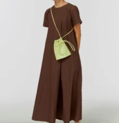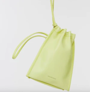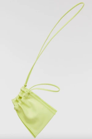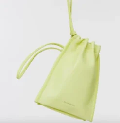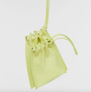Double-pouch bag made with soft lemongrass yellow lamb leather. Cinches to close. Wear as a shoulder, cross-body or waist bag.