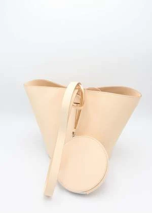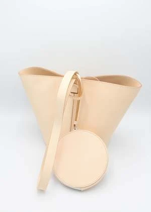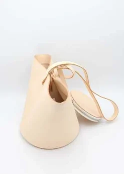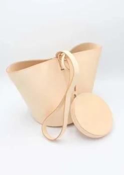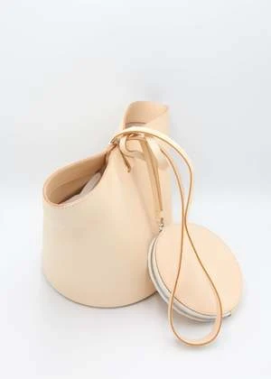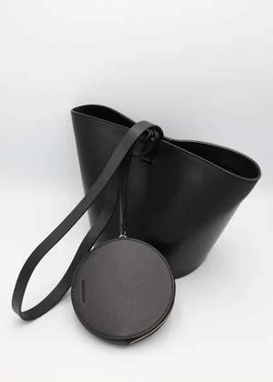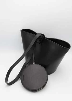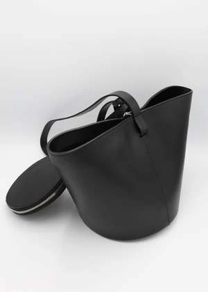Structural, short basket bag in Black vegetable tanned leather. Magnetic top closure. Solid Black vegetable tanned leather shoulder strap. Includes removable small circle zip pouch to be worn inside or out.