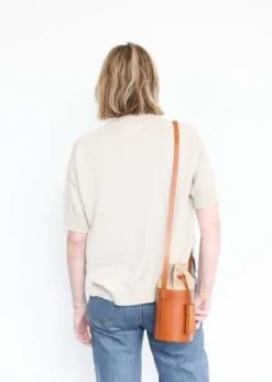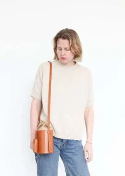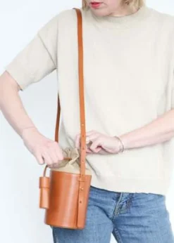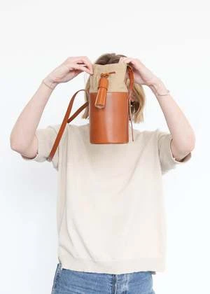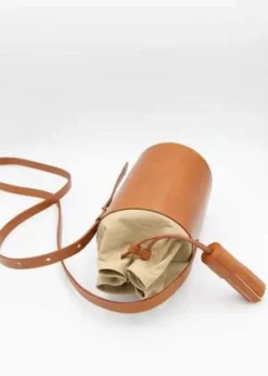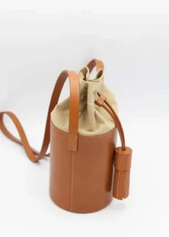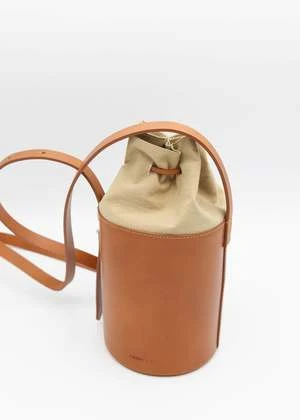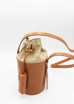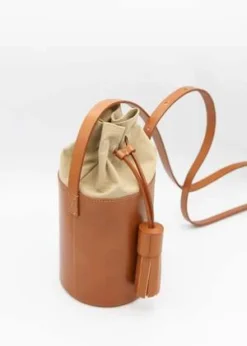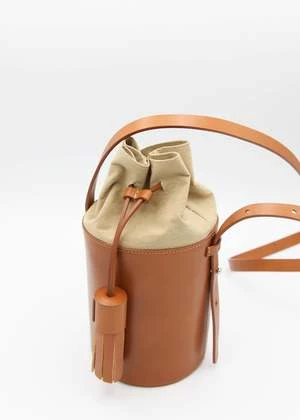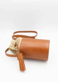Small + slim bucket bag with a structural Chestnut leather base and Khaki Crinkle Nylon body, Single leather tassel, cinch closure, adjustable shoulder strap.