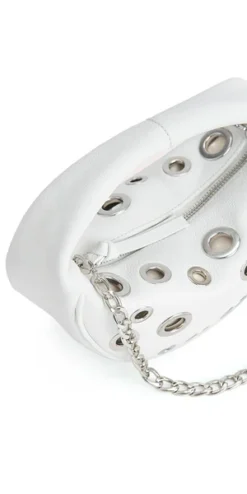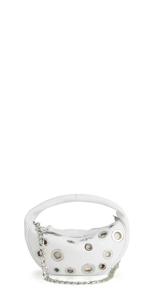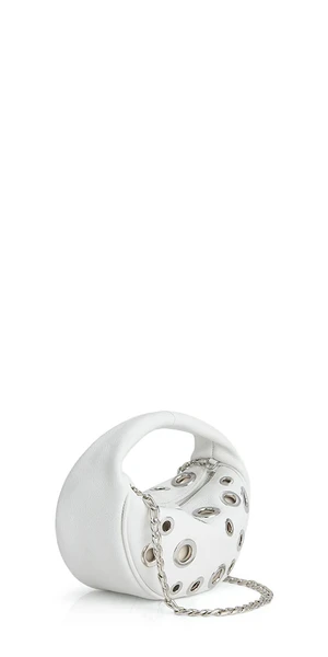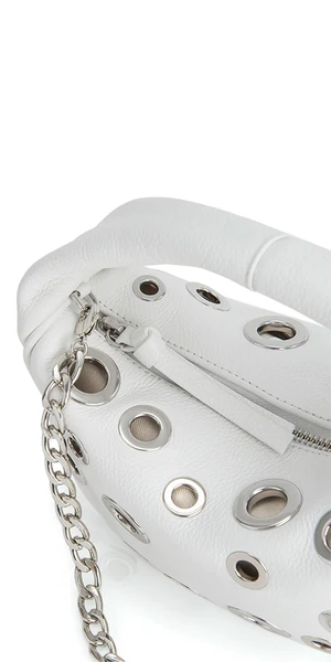 Debuting with shiny eyelets as a highlight of BY FAR’s PF’23 collection, this Baby Cush bag is characterized by an impeccable rounded construction achieved through smooth Italian cowhide. The top-handled style with zip closure and cotton lining is completed with a detachable chain strap so it can be worn as a shoulder bag.