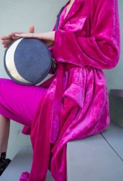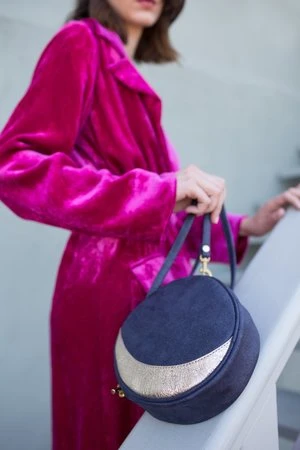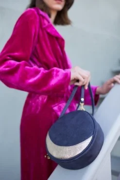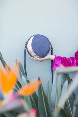 Lunar Phases Mini Circle Bag perfectly small, but still fits everything you need. One side features a crescent moon in gold crinkle leather, the other side features a full moon in silver crinkle leather. The background, gusset and strap are made in a midnight sparkle leather.