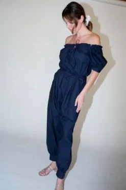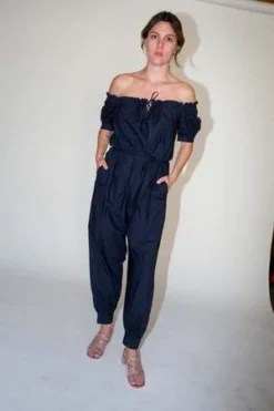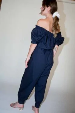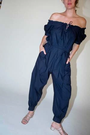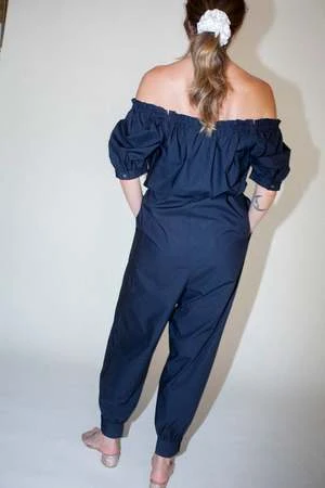 – The Carmen Jumpsuit is the combination of two of Caron’s favorite styles, the Elaina Top and the Cairo Pant. The neckline features a drawstring detail with a front tie closure and the sleeve is lightly puffy with a button cuff closure that matches the cuffs at the ankle. Features an adjustable spaghetti belt and side seam pockets.