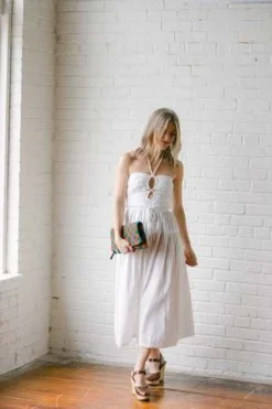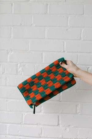 This woven clutch by Clare V features measures 11.5″ x 11.5″. It has tabs to attach a strap.