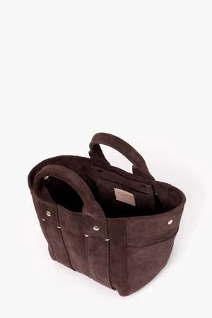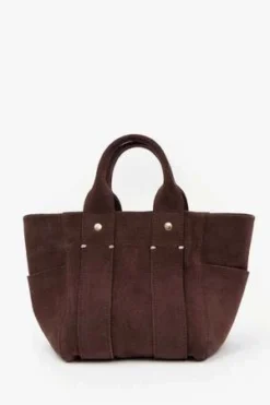 Clare V Le Petit Box Tote in Chocolate Suede. This is a miniature, boxy tote bag that can be transformed into a crossbody or shoulder bag with the addition of a strap. Unlined, featuring D-rings to attach a strap and Chocolate suede interior drop pocket. The tote can hold a wallet, keys and more.