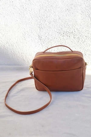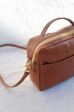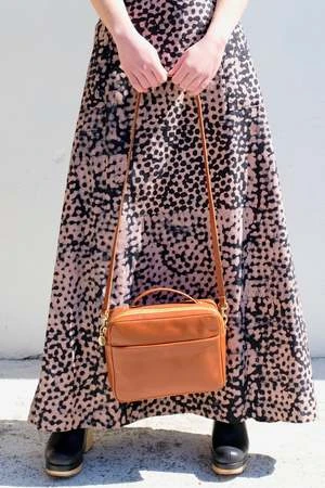 The Mirabel Bag is a chic rectangular design with a crossbody strap and retractable handle. It has an external side pocket, chambray interior pocket, and top zipper to keep your necessities organized.