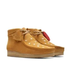 Clarks has collaborated with Vandy The Pink for a second time to create this distinctive take on the Wallabee Boot, inspired by one of the designers most iconic motifs: the cheeseburger. Capturing the colours and textures of the fast-food favourite, Clark’s cult-classic silhouette arrives in premium tan suede thats topped with embroidered sesame seeds to the vamp. And embodying Vandys playful approach, as well as Clark’s dedication to craft, signature logo fobs take on new shapes to represent the all-important fillings: tomato, lettuce, cheese and a juicy patty.