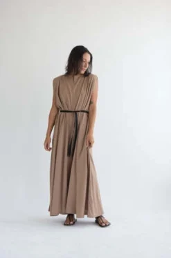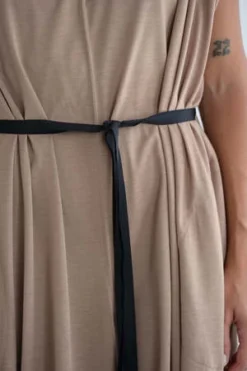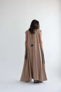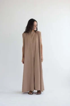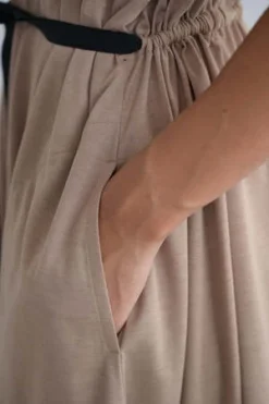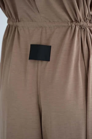 A wide leg jumpsuit featuring a loose-fitting, full length design. Boat neckline, keyhole detailing with single button closure in the back. Side slash pockets, double ribbon ties at waist to created a gathered waistline or wear loose – completely adjustable to your preferred style. Dress up or down with your shoes and accessories.