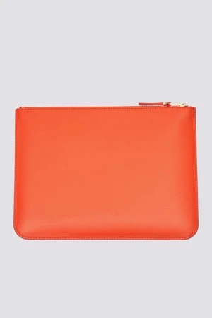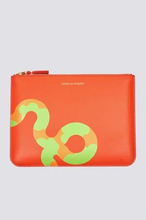 Single large pocket pouch in orange featuring serpent detailing. Long rectangular silhouette with leather lining. Gold zipper with V-tipped zip pull. Ideal for coins, cards and cash.