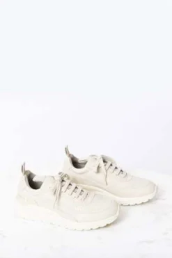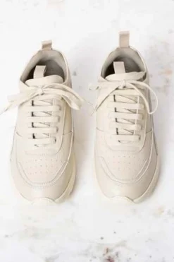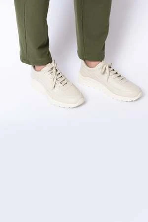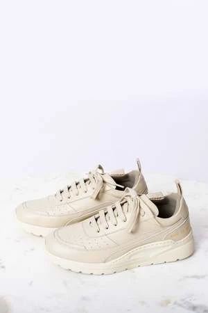 Low-top paneled leather sneakers in off-white. Signature stamp in gold-tone on outer side.