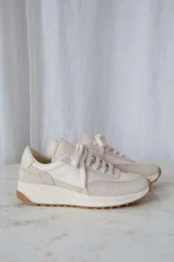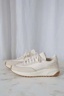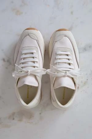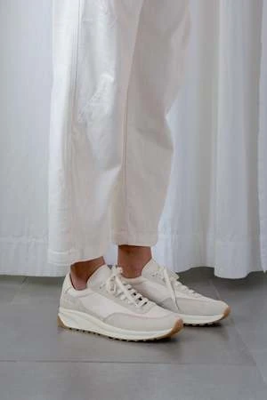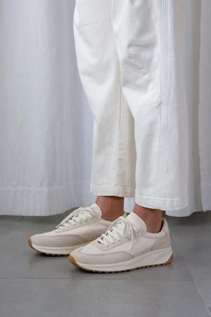 Retro athletic-inspired lace-up track sneakers in off white. Features panels of suede, ripstop and leather. Heels stamped with signature gold foil serial number.