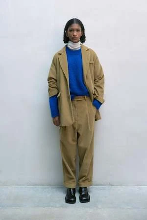 Timeless modernity trousers, designed to wear on any occassion. Made from high quality corduroy with a loose fit masculine shape. They have an elasticated waistband on the back, zip and button closure, finished with front and back welt pockets. Perfect to wear with a shirt, or in set with the blazer, is the uniform everybody needs in their closet.