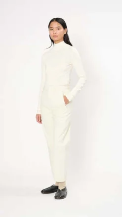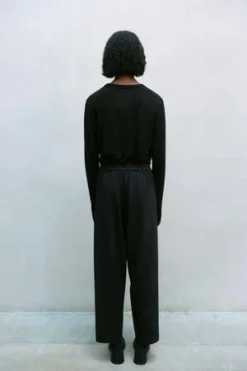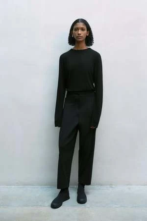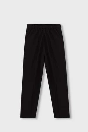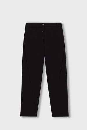 Straight shape for this comfortable and versatile pants, deconstructed with diagonal pleat on the front and central seam on the back of the leg. Designed to feel it loosely on the body, they have elasticated waistband on the back, false pockets and exposed fly buttons.