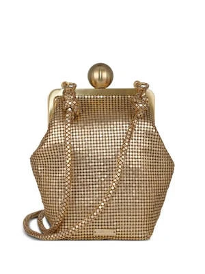 The soft calf leather of Cult Gaia’s Maris Mini Crossbody needs to be touched to be believed. This classic pendulant silhouette features a spherical clasp to keep your belongings safely stored. The leather strap is connected to the body with gold-toned rings that match the gold toned brushed brass Cult Gaia logo on the front of the body. Detachable crossbody strap. Fits a phone.