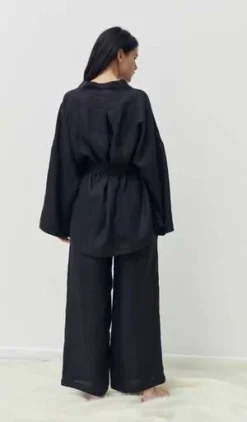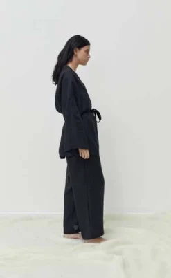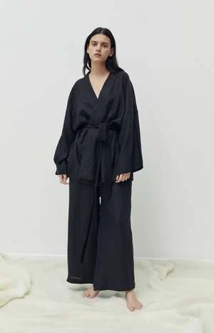 The 01 set in deep black by Deiji Studios has a wrap top (one size fits all) features a waist tie paired with a wide leg pull on pant. Pants are ankle length with a soft elasticated drawstring waist designed to be worn loose.