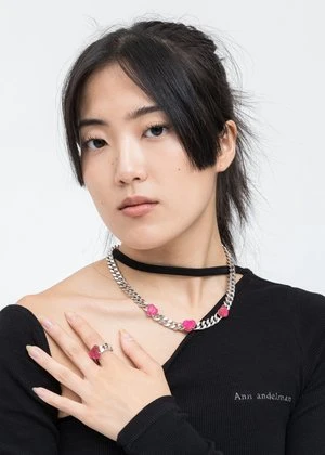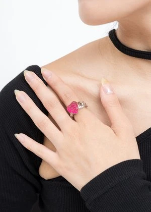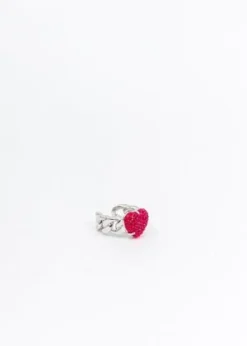 Silver-tone ring with pink rhinestone heart detailing. Cuban-link band. One size.