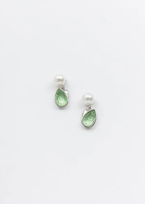 Brass teardrop shaped earring with pearl stud. White gold rhinestone attached by hoop. Stud fastening.