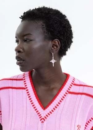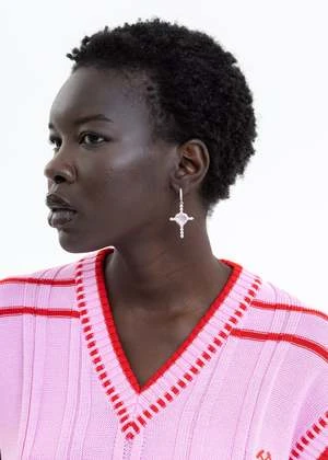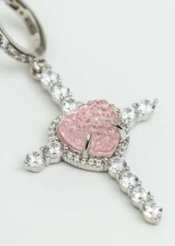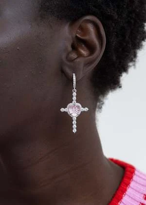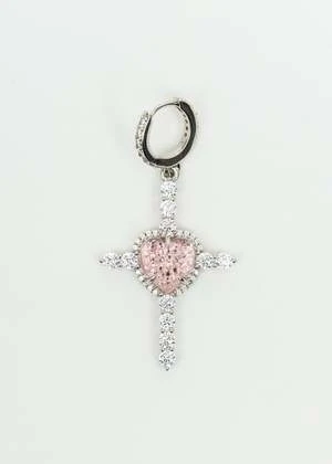 White crystal drop earring in silver-tone. Features a cross pendant with a pink heart-shaped rhinestone centered at the pendant. Crystal detailing along the hinged fastening mechanism.