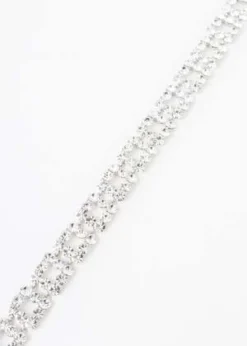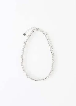 Silver-tone skeletal square-link tennis chain choker necklace. Features square links adorned with rhinestones along the full length. Negative space styling at each chain link. Adjustable lobster-claw closure. Finished with a small logo plate at the fastening mechanism.