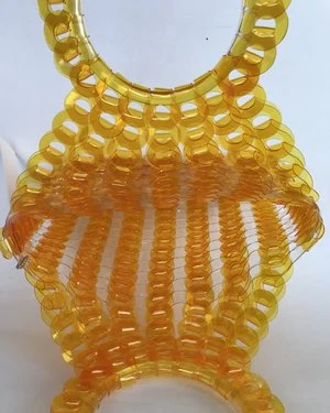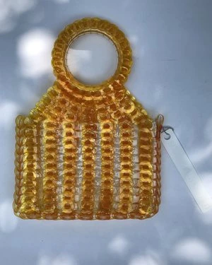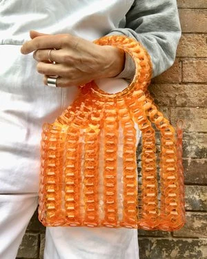 Orange Stripe Large Square Polyvinyl Chloride handbag Width 25cm x Height 35cm(handles incl.) x Depth 3.5cm. Handles are made of lucite wrapped with linked vinyl pieces. Handmade in Berlin, Germany