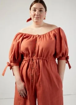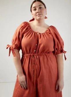The terracotta linen jumpsuit is an oversized jumpsuit with an elasticized neckline, a button front closure, and mid length puff sleeves with adjustable bow ties. It has an adjustable drawstring at the waist and can be worn loose or cinched in. With super wide legs and deep side pockets you’ll want to wear this everyday!