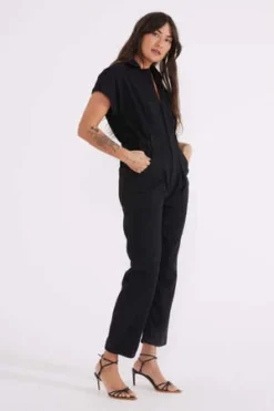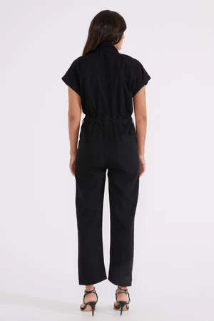 Subtle pleating and utility pockets add vintage appeal to a chic fade-resist black denim jumpsuit.