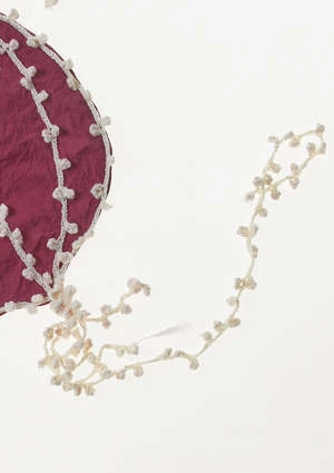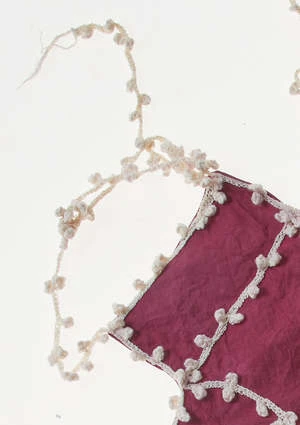 DESCRIPTION: BURGUNDY TOP WITH HANDMADE CROCHET STRIPES. ADJUSTABLE CLOSURE AT THE BACK WITH THE STRIPES