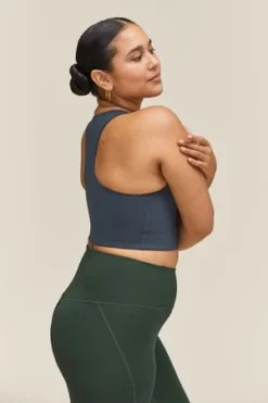 – An extra high-rise with four-way stretch and compressive fabric made from recycled water bottles.
