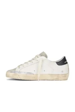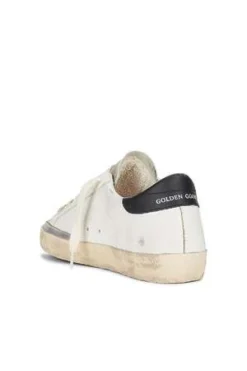 Golden Goose Super Star Sneakers with White Leather Body, Black Leather Heel Tab, Perforated Skate Star, and Suede Toe.