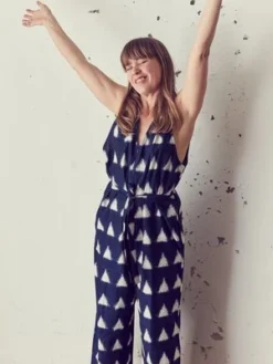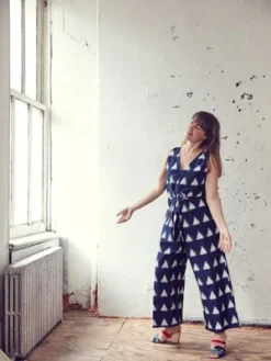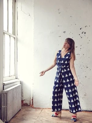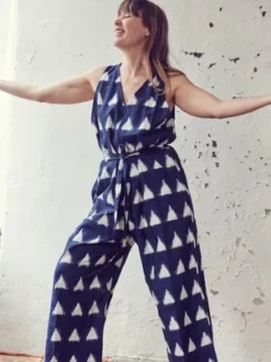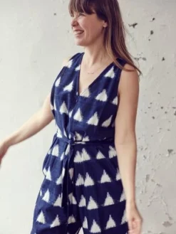 – versatile like few this wide cut jumpsuit has pockets, a V neck with an invisible front zipper & a loose belt. Navy & cream Ikat, 100% cotton weave, made fair trade and with minimal waste in India.