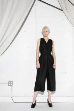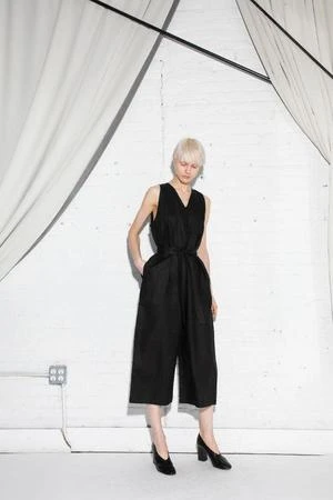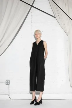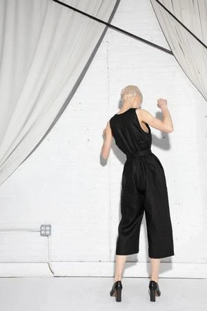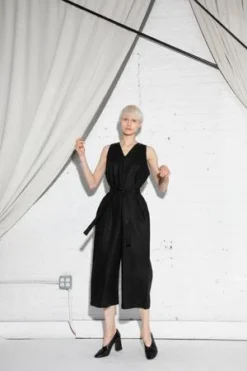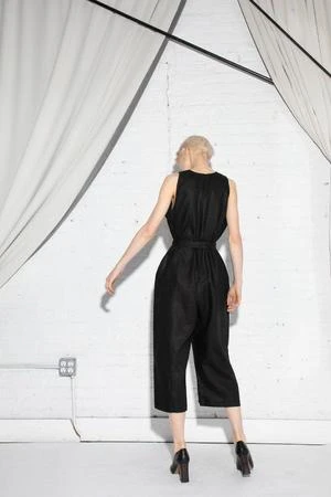 – versatile like few this wide cut jumpsuit has pockets, a V neck with an invisible front zipper & a loose belt. Black 100% linien, made fair trade and with minimal waste in India.