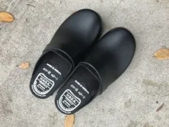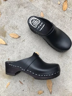 Classic Swedish clogs with 1 3/4 heel and rounded toe. Veg-tanned leather and black wooden base with rubber sole. European sizes: 35-41.