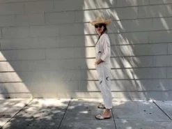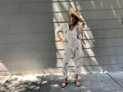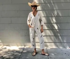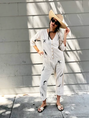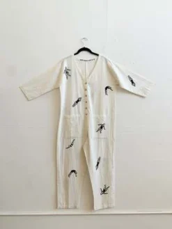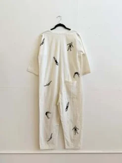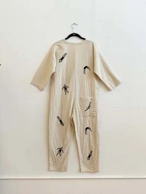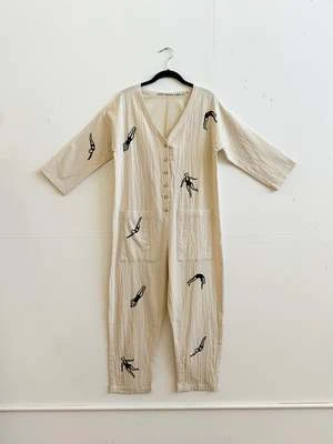 Black swimmers hand-block printed on a natural cotton that’s hand-spun and hand-waved in India. One size fits many. Relaxed look.