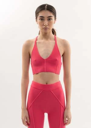 Slim fit viscose-blend rib-knit micro top. Features an elasticized slim-fit construction with exposed seam detailing throughout. Halter neck collar. Finished with tonal stitching throughout.