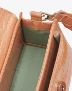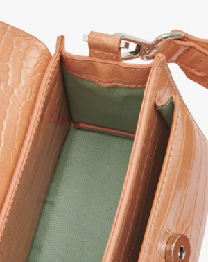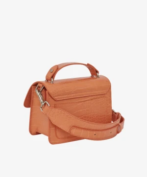 Mini bag with short handle and attachable adjustable crossbody strap. The bag has one main compartment along with a front pocket.