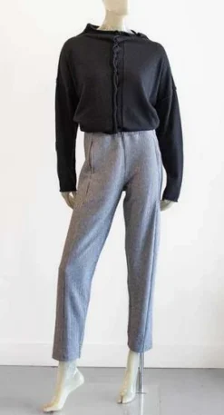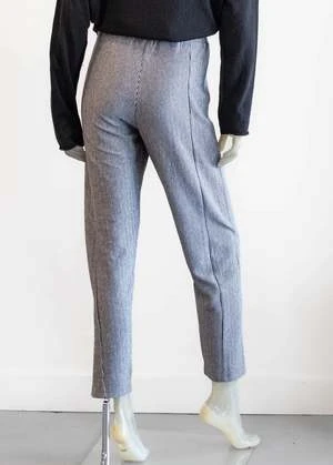 From our customer favorite line Iridium, this striped soft pima cotton pant features a longer tapered leg, hidden front pockets, elastic waistband, and available in a light/dark gray stripe pattern. Perfect silhouette for wearing with both a shorter blouse, or a longer sweater.