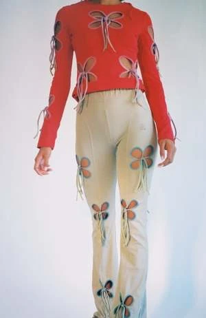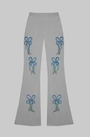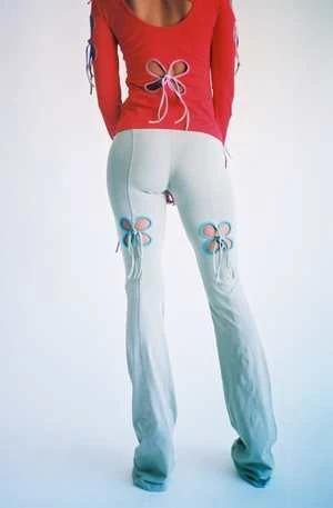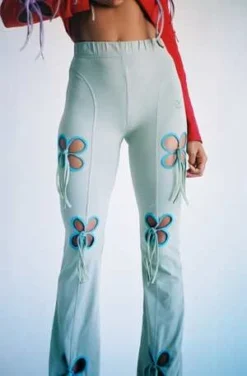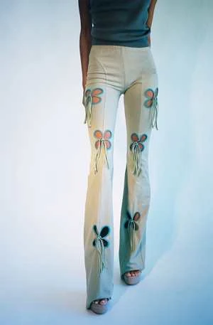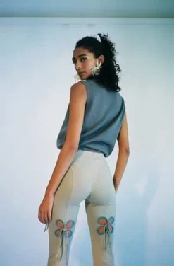 Fitted pant with elasticized waist and flared bottoms in beige. Made from soft jersey. Small monochromatic embroidered logo in the front. Blue ombre cut-outs in the form of flower petals, edged with a ribbon in the form of stamens are stationed throughout the piece. The ribbons are tied to create a flower shape. Worn with the Red Petal Long Sleeve and Deep Fog Apollo Vest.