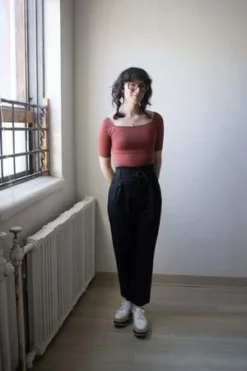 Jennifer Glasgow’s Lozen Pants are fashionable and comfortable. Made out of a blend of cotton and spandex, the Lozen Pants are loose and stretchy. These vintage-inspired pants have a high waist, front pleats and matching D-ring belt. We love the practical details of the elastic waistband and side pockets that make them even more wearable. Style them for work or play!